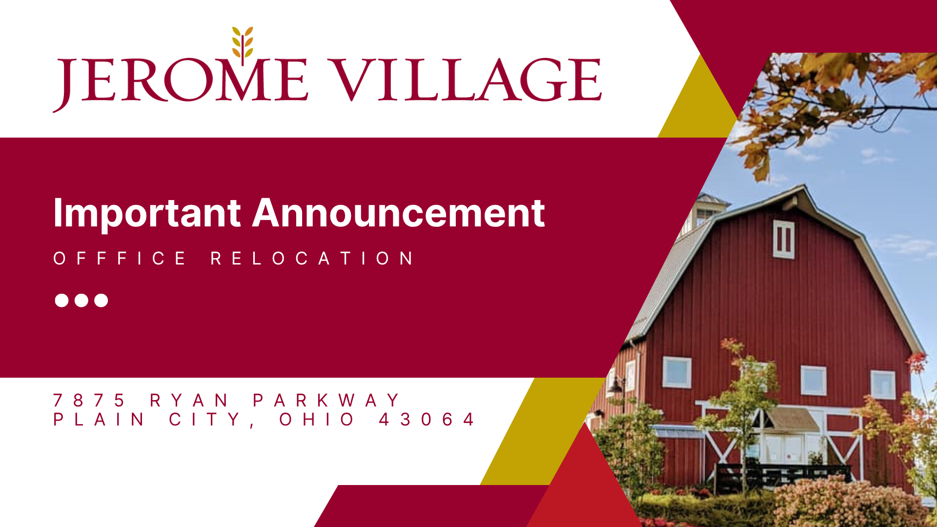 The Property Management Office will officially relocate from Brock Road to the loft inside the Jerome Village Community Center. To accommodate this move, the management offices will be closed Thursday, October 30 and will reopen Friday, October 31 at: