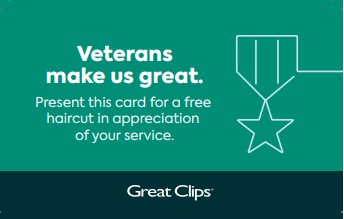 On Nov. 11, veterans and active service members can visit the Great Clips at Jerome Village Market salon from 9 AM -8 PM and get either a free haircut or a free haircut card to use later. In addition, non-veteran customers who get a haircut service on Veterans Day at Great Clips salons can pay it forward. They receive a free haircut card they can give to an active service member or veteran as a token of thanks. The cards can be redeemed for a free haircut from Nov. 12 to Dec. 5, 2025 at any Great Clips salon.