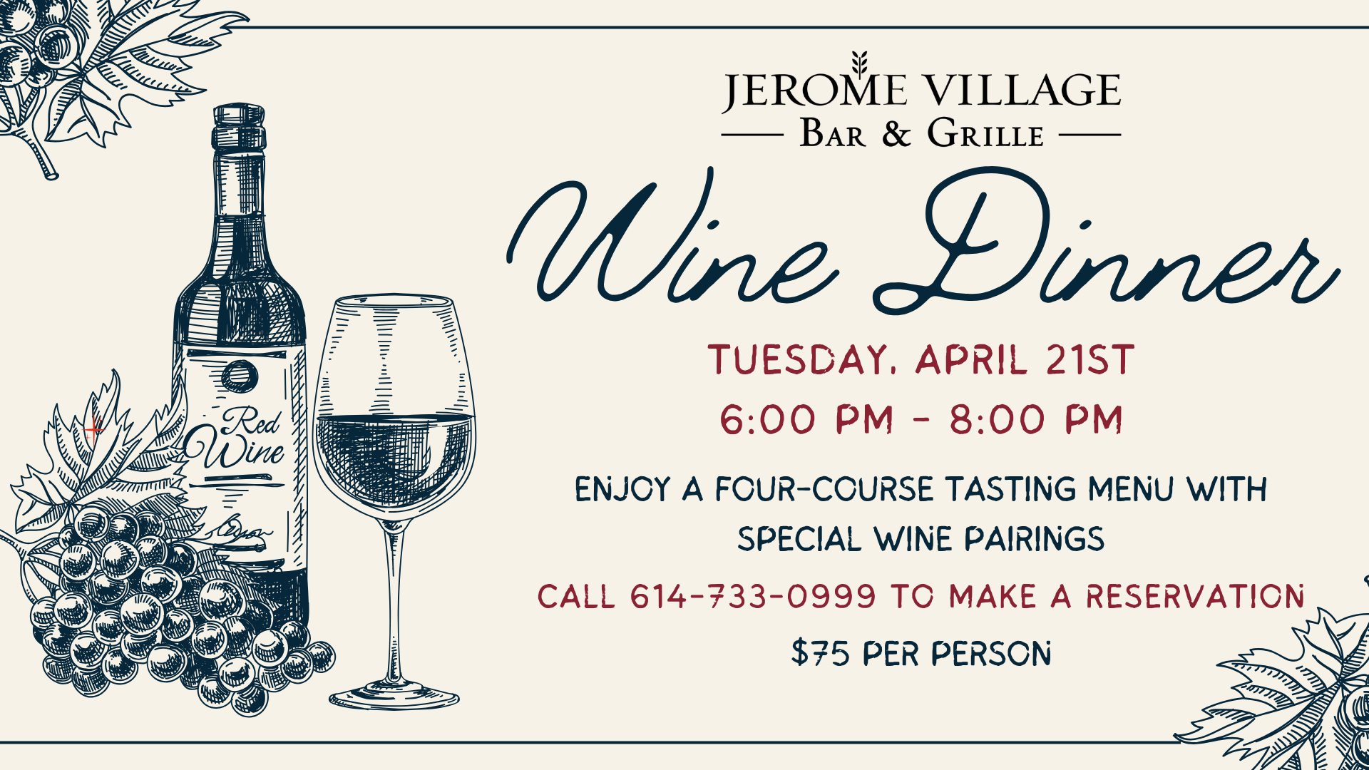 Reserve your seat for the second annual Jerome Village Bar & Grille Wine Dinner, an evening of exceptional flavors and refined paired wines. Guests will enjoy a thoughtfully curated four‑course tasting menu, expertly matched with wines selected to complement every dish.